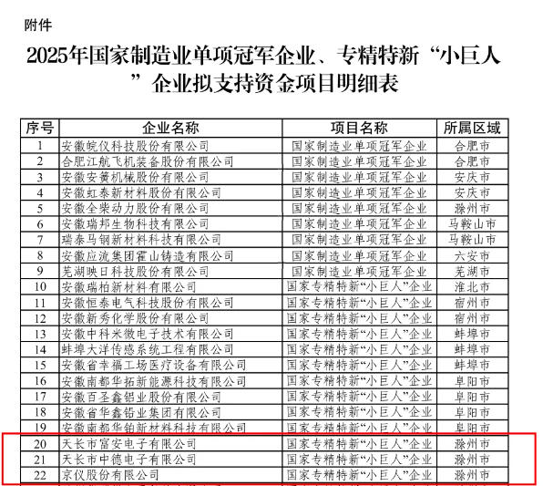 根据安徽省工信厅zui新公示,天长市富安电子有限公司、天长市中德电子有限公司、京仪股份有限公司3家企业入围国家制造业单项***/军及专精特新“小巨人”企业拟支持项目。