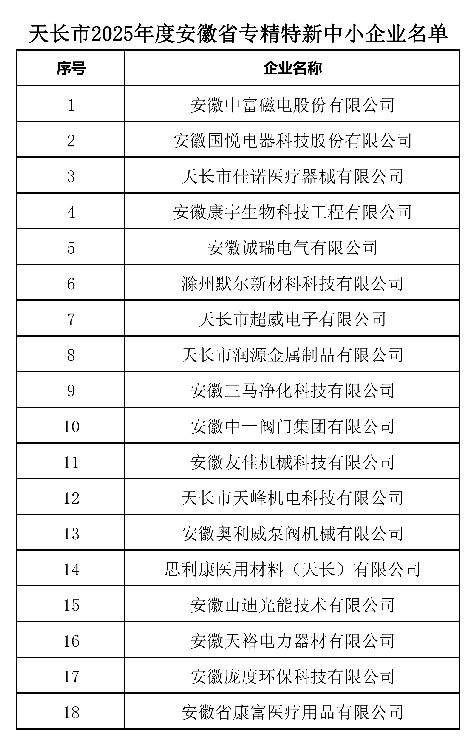天长市共有18家企业成功入选安徽省专精特新中小企业认定,42企业成功通过专精特新中小企业复核!喜获省级专精特新中小企业称号!